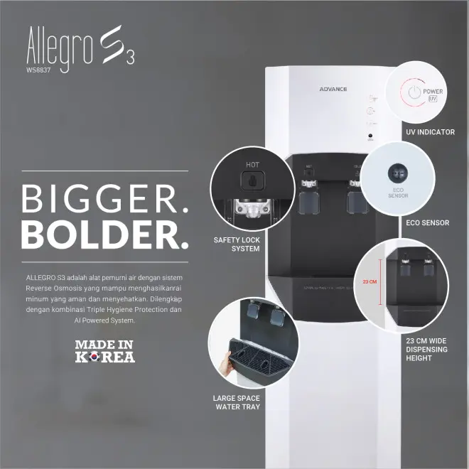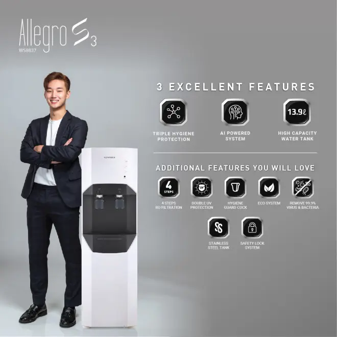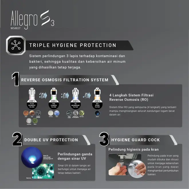 ALLEGRO S3 adalah alat pemurni air dengan sistem Reverse Osmosis yang mampu menghasilkan air minum yang aman dan menyehatkan. Dilengkapi dengan kombinasi Triple Hygiene Protection dan AI Powered System. TRIPLE HYGIENE PROTECTION sistem perlindungan air minum dari kontaminasi Zat kimia berbahaya logam berat terlebih dari virus yang ada di dalam air secara menyeluruh. AI POWERED SYSTEM teknologi AI yang mengatur sistem ECO Sensor dan UV Star Mode secara otomatis.